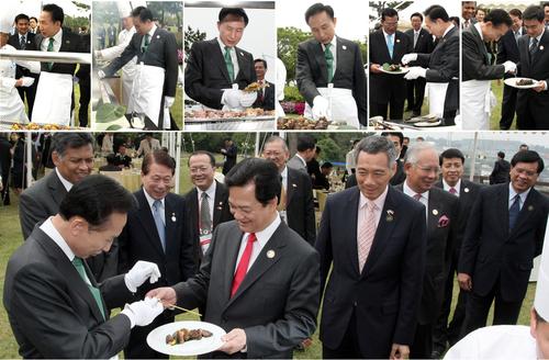 除因“身體不適”而缺席的菲律賓總統(tǒng)阿羅約以外,其他東盟各國首腦悉數(shù)到場(chǎng),李明博細(xì)心烤制牛肉、為伊斯蘭首腦準(zhǔn)備的羊肉串、為素食主義者準(zhǔn)備的鮑魚燒烤等10串燒烤,一一放在各國首腦的盤子當(dāng)中。
