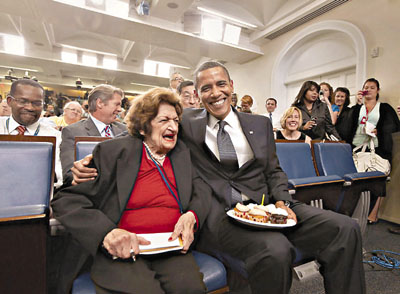 8月4日是奧巴馬48歲生日,也是赫斯特報系專欄作家湯馬斯的89歲生日。白宮首席發言人吉布斯在白宮新聞發布室內進行每日簡報,大批記者聚集向他提問,此時,奧巴馬捧杯形蛋糕入內,帶領記者團為湯馬斯唱生日歌。