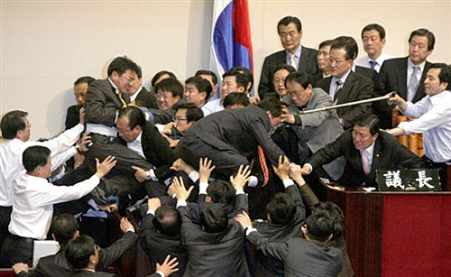 韓國國會議員2007年12月14日因一項(xiàng)彈劾檢察官的提案而發(fā)生大規(guī)模群毆,這些檢察官為呼聲最高的總統(tǒng)候選人李明博清除了詐欺罪嫌。據(jù)“中央社”報道,在大約100名在野黨籍議員以桌椅阻擋國會主要議事廳的出入口后,一群親政府的議員被迫穿越圍欄以設(shè)法進(jìn)入議事廳。 chinanews發(fā) 攝