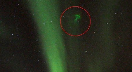 在一張他于1月21日拍攝的照片中,右上方有一個(gè)像綠色水母,又像降落傘的奇怪物體。米凱森描述說,“這個(gè)物體影像具有跟北極光相同的綠色。這意味著北極光是造成這個(gè)物體成影的光源。”