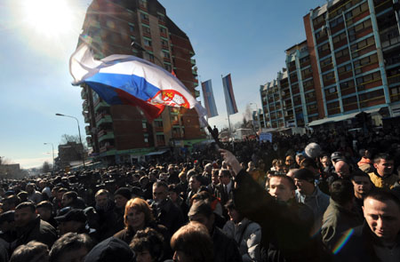 19日中午,幾千名塞族學生在大橋北岸游行,塞爾維亞國旗迎風飄舞。游行是在12點44分開始的,寓意是聯合國安理會第1244號決議。該決議重申南聯盟(主權地位后為塞爾維亞繼承)對科索沃地區(qū)擁有主權。