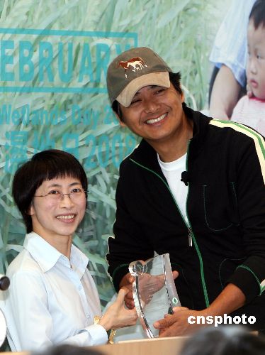十月二十日,國際影視巨星周潤發(fā)在香港濕地公園舉行的世界濕地日2008香港區(qū)慶祝活動啟動儀式上,獲頒濕地保育大使委任狀。中新社發(fā) 武仲林 攝