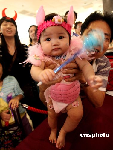 二十八日,香港一百多位5-12個月的BB打扮成各種模樣,在荷里活廣場參加“嘩鬼BB爬行大比拼”比賽,慶祝萬圣節的到來。圖中BB的父母們為參加這項活動精心打扮孩子,使出渾身解數引誘BB向前爬行。香港多家商場今日借輕松而又有趣的萬圣節做宣傳主題,帶動商場人氣熱旺。中新社發 王麗南 攝