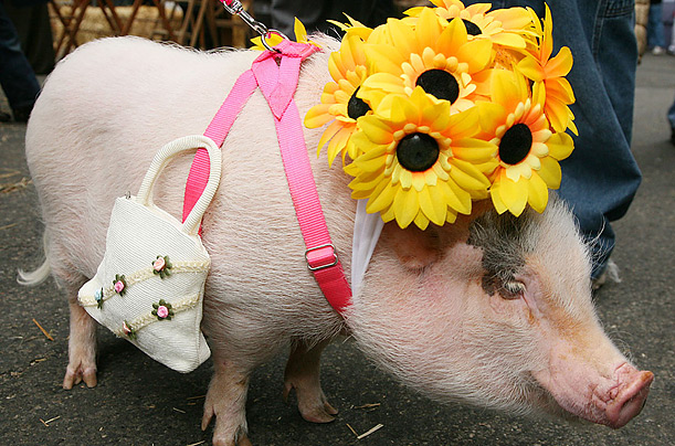 圖片六:在紐約城舉辦的第三十三屆麥茜畫展上,“豬小姐”頭戴鮮花,身背女士小坤包閃亮登場(chǎng),吸引了眾多的目光。(鐘巖)