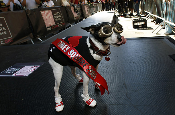 圖片十六:在十月二十一日時代廣場舉辦的群狗化妝晚會大賽開始之前,2006年大賽的冠軍派普正走上比賽舞臺,與大家打招呼。(鐘巖)
