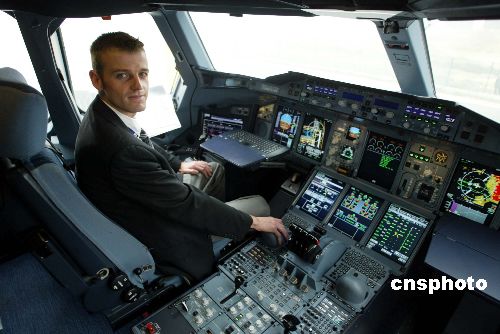 圖為空中客車公司2007環球飛行的空勤人員展示A380客機寬大的駕駛艙。
