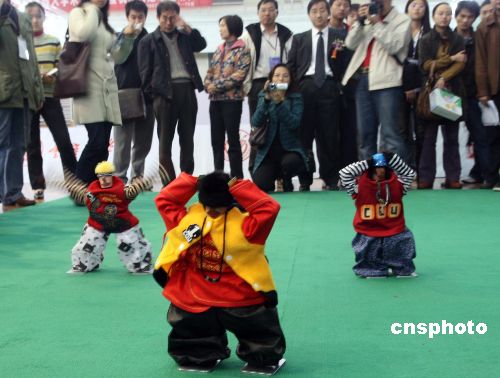 圖為重慶大學(xué)自行研制的機器人在開幕式上表演舞蹈,吸引觀眾注目。