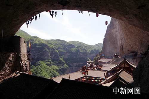 抱腹巖為綿山百余處巖洞之首,因形如兩手抱腹,所以又叫抱腹巖。抱腹巖之腹大,大得驚人:抱二百余間殿宇禪房及一兩萬名游人于腹內而不顯得擁擠。抗戰時期,介休抗日民主政府常在這里召開全縣軍民大會,部署生產和戰斗任務。抱腹巖是天然生成的超大型禮堂.抱腹巖坐東面西,為一高約18丈,長約45丈,深約15丈的巨形巖洞。巖洞分上下兩層,上層是兩個直角排列的大巖洞,很象磚圈的“無量殿”,路斷處有木棧道溝通,自下仰望殿宇參差,勾欄蜿蜒,猶如空中樓閣.更引人注目的是巖洞頂壁的無數個鳥洞和懸掛著的銅鈴。抱腹巖掛鈴為綿山一絕,每逢廟會,許了愿的善男信女們便雇人從巖頂將掛鈴者用繩子吊在半空,然后利用前后晃動的力量將人悠進洞內,用鐵鉤鉤住頂壁打楔系鈴。操作完畢后再用繩子把掛鈴者放到巖下。場面驚心動魄,令人嘆為觀止。清代康熙年間介休文人王清在《抱腹巖》一詩中寫道:“寺古云常在,巖空勢欲傾。此中真得地,以外縱浮名。鳥拂金鈴渡,僧緣石隙行。坐聽梵響處,花雨落無聲”,可謂繪聲繪色的抱腹巖寫照.其中“鳥拂金鈴渡,僧緣石隙行”更成為人們廣泛傳頌的名句。很久以前,綿山中生活著一種叫吻的野獸,非常兇猛,常常傷害過往行人.附近的村民靠山吃山,以采藥為生,而野獸封山,村民們無不頭痛萬分/于是推薦了一個身體強健,狩獵本領很強的年輕人前去降吻。這個年輕人想只憑自己的力量那太微不足道了,如果能得到神靈的保佑,一定會萬無一失。于是他就去求空王佛保佑,祈求老人家賜給自己一件法寶,以降服吻獸.年輕人祈禱完畢,正要走時,忽然看見供案上金光閃閃,霎時滿殿生輝。走近一看,原來是只銅鈴,銅鈴上還有一道經文。這時殿內突然有個縹緲的聲音:“念此咒,便可降住怪獸,快快去吧.”年輕人這才恍然大悟,慌忙叩拜點化之恩.后來果然降服了吻,人們為了感謝空王佛的慈悲之心,就把這個銅鈴掛在抱腹巖的巖頂上,讓它為人們消災免禍.