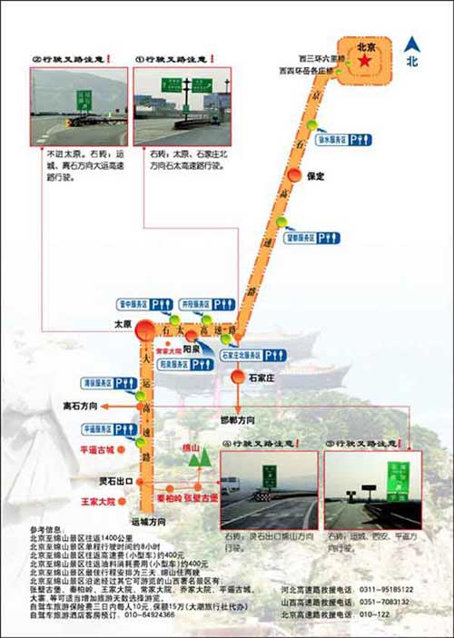 綿山風(fēng)景區(qū)和世界文化遺產(chǎn)——平遙古城;大紅燈籠高高掛——喬家大院;中國民間故宮,華夏第一民居——王家大院,華夏第一柏——秦柏嶺景區(qū)等,近在咫尺,任您組合,名山,名城,名院,名樹一游皆得。山西省境內(nèi)大運(yùn)高速公路,貫穿南北,從北京至綿山全程高速公路680公里(京石高速—石太高速—大運(yùn)高速—靈石或介休下高速)僅需7個(gè)小時(shí)車程。在北京西站乘N203次或2519次空調(diào)專列到介休。