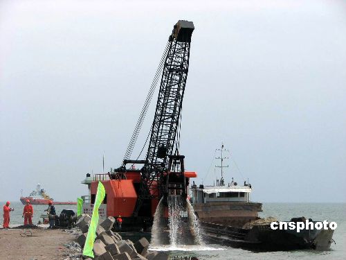 12月24日上午10時,“南海一號”靠近碼頭,直至當日下午4時沒有前進,登陸時間不能確定,挖沙船正在岸邊清理航道。中新社發(fā) 索有為 攝