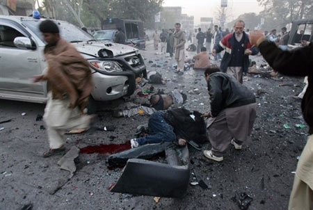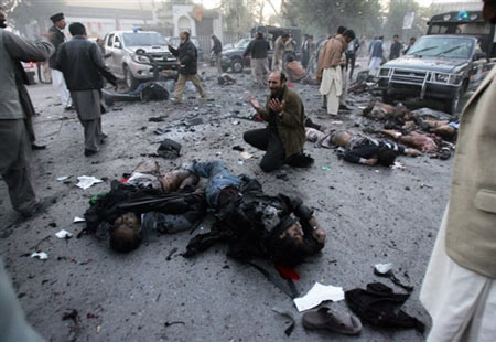 中新網12月27日電 據法新社報道,道巴基斯坦前總理貝-布托今日在競選集會上遭到炸彈襲擊,不治身亡。圖為爆炸現場。