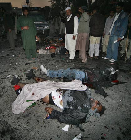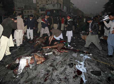 中新網(wǎng)12月27日電 據(jù)路透社報(bào)道,巴基斯坦前總理貝-布托今日在競選集會(huì)上遭到炸彈襲擊,不治身亡。圖為爆炸現(xiàn)場。(關(guān)新)