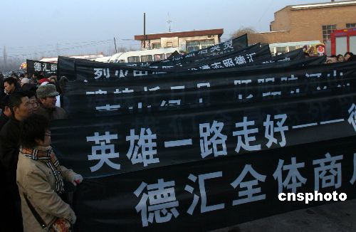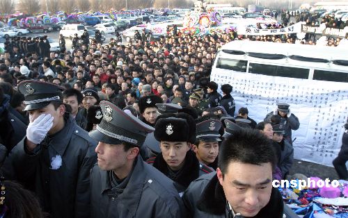 1月7日上午,烏魯木齊市燕兒窩殯儀館,萬余名烏魯木齊市民悼念在“1.2”火災中犧牲的消防戰士朱曉雷、張宇、高峰3位烈士。朱曉雷、張宇、高峰的英雄事跡在社會上引起強烈反響,新疆各族群眾自發前往吊唁。自治區人民政府追授三位烈士為“模范消防衛士”,公安部批準他們為革命烈士,自治區團委追授三位烈士“新疆青年五四獎章”,自治區公安廳授予三位烈士“優秀共產黨員”榮譽稱號。中新社發 李雄心 攝