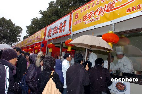 圖為當地日本民眾正在冒雪排隊品嘗中國餃子和刀削面。