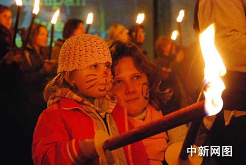 一對母女3月15日晚上在捷克首都布拉格和平廣場上舉行的要求外國軍隊撤出伊拉克的反戰火炬集會上。