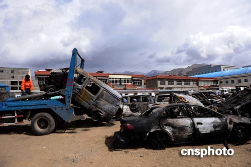 3月19日,拉薩市城關(guān)區(qū)環(huán)保局的工作人員正集中處理被焚車輛。