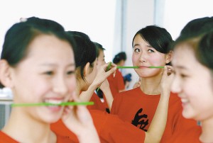 于是,姑娘們每天對著鏡子練微笑。老師要求每個人在練習笑容時,嘴里都要咬著一根筷子找感覺。這樣一笑就得幾十分鐘,笑得連臉部肌肉都麻了,有時甚至會磨破嘴。