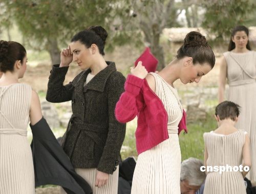 當地時間3月23日,北京奧運圣火采集最后一次彩排在希臘古奧林匹亞遺址舉行,參加演出的女祭司正換裝。