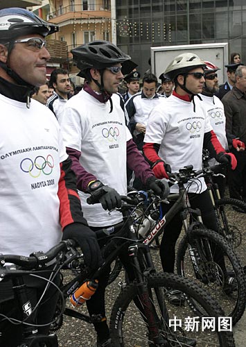 3月27日,北京奧運(yùn)圣火希臘境內(nèi)傳遞第四天,山城納烏薩迎來(lái)第一個(gè)慶典儀式。山地自行車手準(zhǔn)備護(hù)送奧運(yùn)圣火離開(kāi)。中新社記者:王歡