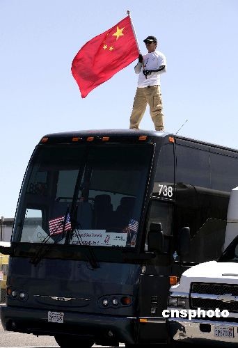 洛杉機華人華僑組團北上,為北京奧運圣火吶喊助威。一位男子站在他們乘坐的大巴頂上揮舞五星紅旗高喊“北京加油”。劉丹 攝