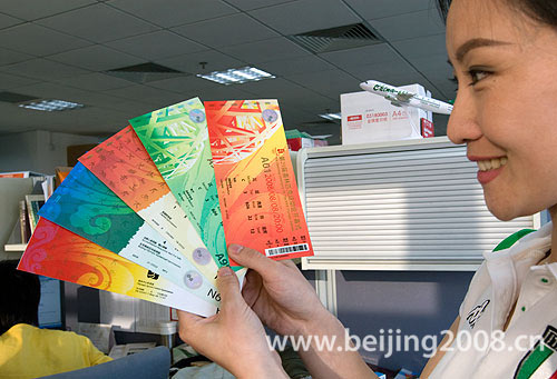 中新網4月23日電 北京時間今天上午,“北京奧運會第三階段票務銷售情況新聞發布會”在北京奧運新聞中心舉行。北京奧組委票務中心主任朱炎和北京奧運會奧運藝術中心主任王敏一起揭開了北京奧運會門票的票樣。
