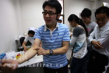 何潔、黃雅莉是約好一起開車到血液中心的,并在車上填完獻(xiàn)血申請表。看到血液中心竟然有這么多人在獻(xiàn)血,她們也很激動,“不知道這么多人都會來啊,都是為災(zāi)區(qū),感覺很感動。”何潔說:“我以前在四川上學(xué),已經(jīng)問候了那邊的朋友,他們都很平安。今天是我第一次獻(xiàn)血,感覺還好吧。”同來的黃雅莉雖然緊張,但還是很期待:“哎,不就是抽點(diǎn)血嘛,抽完了就好啦。”在聽說好朋友李宇春也來獻(xiàn)血時(shí),她們很關(guān)心:“春春暈血,她現(xiàn)在沒事吧。”不過在進(jìn)入驗(yàn)血室時(shí),剛剛還一副豁出去樣子的黃雅莉卻像孩子一樣跟公司的工作人員說:“其實(shí)我還是有點(diǎn)緊張哈!”但是她在何潔抽血時(shí),卻不停地給同伴鼓勵(lì):“何潔,別緊張,我支持你哦!”