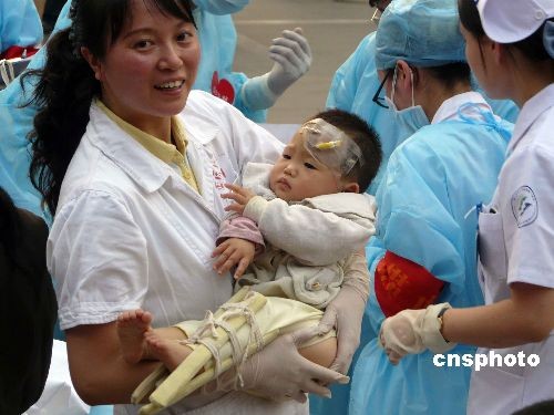 5月19日下午五點半多,四川汶川地震災區(qū)的一批重傷員抵達重慶,重醫(yī)附一院的醫(yī)生護士象解放軍野戰(zhàn)醫(yī)院搶救傷員一樣投入搶救,猶如前方的戰(zhàn)場。
