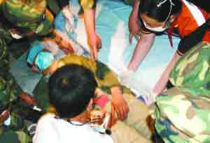 “我們迅速組織了搶救小組,全力營救。”第二軍醫大學校長張雁靈少將說,彭國華送來時已是生命垂危,呼吸微弱,血壓很低。經過3小時搶救和綜合治療,彭國華脫離了危險。據二軍大醫療隊成員透露,目前彭國華生命體征平穩,已經能夠在別人的攙扶下下地行走。
