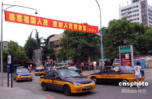 5月26日,四川地震災區綿陽街頭打出“感恩祖國人民,感謝人民解放軍”的橫幅。四川汶川8級大地震發生后,中國各地發揚“一方有難 八方支援”的精神,以捐款捐物、救治傷員、對口支援等形式全力支持災區抗震救災,約有10萬余名軍隊人員參與到此次救援抗災中。中新社發 劉萬強 攝