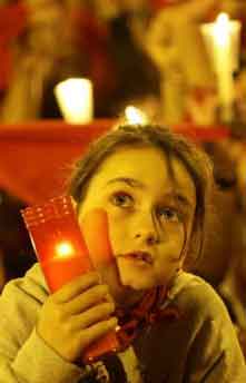 15日凌晨,一個小女孩手舉蠟燭參加西班牙奔牛節閉幕活動。