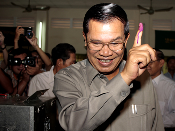 柬埔寨首相洪森周日選舉投票后表情輕松。(金邊郵報(bào)圖)