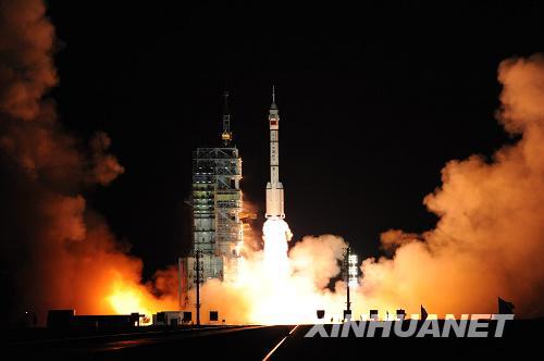 9月25日21時10分,長征二號F型運載火箭點火,神舟七號飛船在酒泉衛(wèi)星發(fā)射中心升空。新華社記者李剛攝