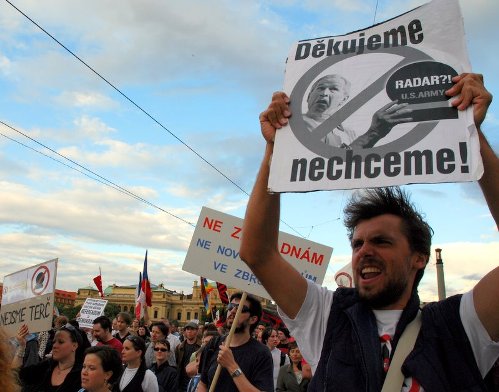 資料圖片:數千捷克民眾今年8月8日在布拉格舉行示威游行,抗議政府簽約同意美國在捷克建立反導雷達基地。這位示威者舉著的標語寫道:“謝謝,我們不要美國雷達!” (攝影:黃頻/中歐社)
