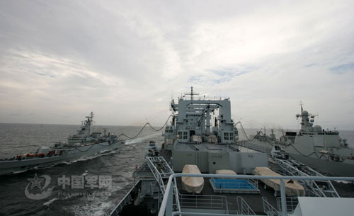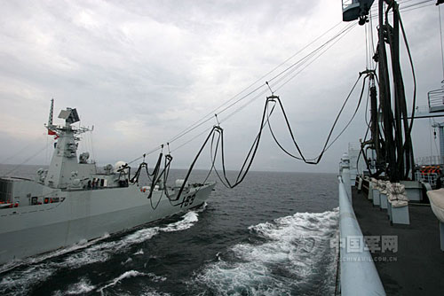 10月9日,南海艦隊某作戰支援艦支隊同某驅逐艦支隊數艘驅護艦,在二級海況下成功組織了高難度的“兩橫一縱”海上補給訓練。他們克服風大流急的影響,經過多次協同演練,航行中的補給對接時間比最初縮短了10多分鐘,海上應急支援能力得到提高。 中國軍網發 繞燕文攝