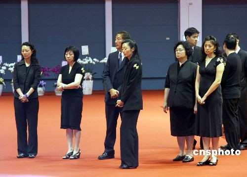 臺塑企業創辦人王永慶的遺體十七日由長榮班機運抵臺灣,靈堂設在桃園縣的長庚大學活動中心。圖為王永慶的親屬守候在靈堂內。中新社發 耿軍 攝