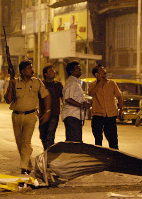 當地警方證實,武裝分子使用手榴彈和AK-47沖鋒槍襲擊了孟買市中心CST火車站、維多利亞火車站、泰姬瑪哈酒店、孟買市政府等著名建筑。武裝分子還同警方和印度特種部隊發生激烈交火。在交火中,孟買反恐特種部隊司令殉職。