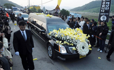 有關人員捧著牌位和無窮花大勛章出來,隨后盧武鉉前總統的棺柩經過峰下村,運至黑色凱迪拉克,現場傳出哀戚嗚咽的哭聲。