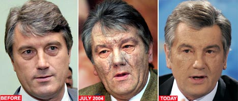 烏克蘭總統尤先科3年前因遭人投毒毀容,一張英俊的臉變得粗糙黯淡不堪,布滿疙瘩。3年的時間過去,隨著身體的漸漸恢復,尤先科也終于大致恢復到往昔的容顏。