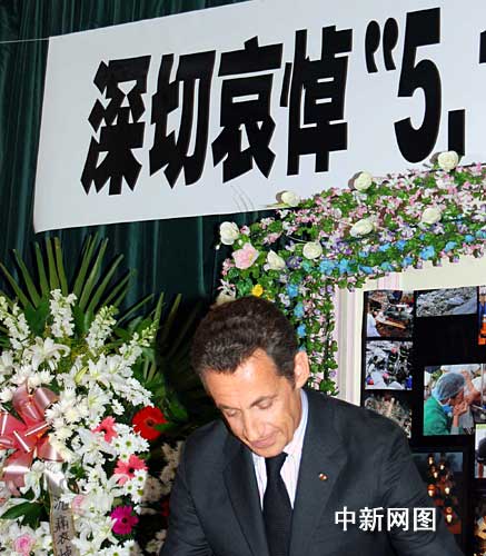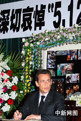 在中國駐法大使孔泉的陪同下,薩科奇總統來到悼念大廳,向中國地震遇難者表示深切哀悼。而后,薩科奇在留言簿上寫道:我們支持經受了巨大考驗的中國人民。
