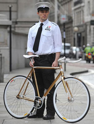 這輛自行車受英國環境運輸協會委托定制而成,鏈條、座位、車把手都和普通自行車的一樣,不過表面卻鍍上了24克拉的黃金。由于在英國,售價超過4000英鎊的自行車都不能享受保險“待遇”,因此購買這輛自行車的人還必須雇一位“保鏢”,在公共場合負責看管。