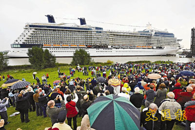 據香港《文匯報》30日報道,“名人至尊號”日前在兩艘拖艇協助下,駛過德國帕本堡邁爾造船廠的水閘,駛出北海,將前往丹麥。這郵輪的造船工程大致完成98%,將于本年11月正式處女首航,成為一艘美國旅游船。