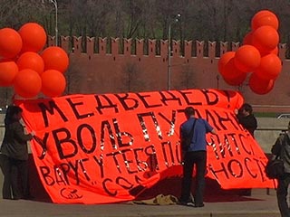 據(jù)俄羅斯新聞網(wǎng)報(bào)道,俄羅斯反對(duì)黨“團(tuán)結(jié)運(yùn)動(dòng)”組織成員4月28日在克里姆林宮前舉行了聲勢(shì)浩大的反政府游行活動(dòng)。期間,3名“團(tuán)結(jié)運(yùn)動(dòng)”的積極分子在克里姆林宮附近的河岸邊懸掛紅色的巨型橫幅,上面印有:“梅德維杰夫,辭去普京總理職務(wù)。”字樣,橫幅兩邊系有紅色的氣球,橫幅下部印有“團(tuán)結(jié)運(yùn)動(dòng)”組織的徽標(biāo)。