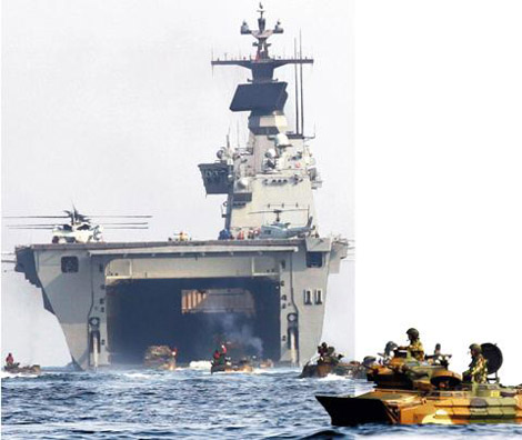 報道說,此次韓美聯合登陸演習由韓國軍隊首次擔任整個登陸作戰的總指揮,而且韓國的第一艘1.4萬噸級大型登陸艦獨島艦首次亮相。