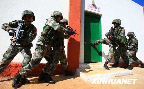 12月7日,在印度貝爾高姆地區,中方參訓分隊進行房屋清剿戰術演示