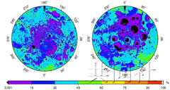 該天文臺的研究小組根據“月亮女神”的激光高度計測得的數據制成了月球表面緯度85度以上的極地的詳細地形圖,并根據該圖計算了2000年1月1日起的2千天的日照區域。