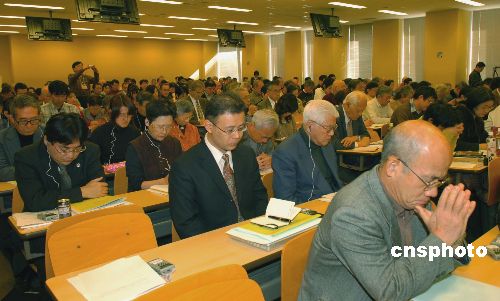 12月15日上午,為期兩天的南京大屠殺七十周年國際研討會在東京明治大學拉開帷幕,來自中、日、美、法、德等國的學者、律師、媒體界人士及普通民眾數百人,就戰爭責任、戰爭賠償等問題展開討論。圖為研討會開始前,全體與會者為戰爭死難者默哀。 中新社發 朱沿華 攝