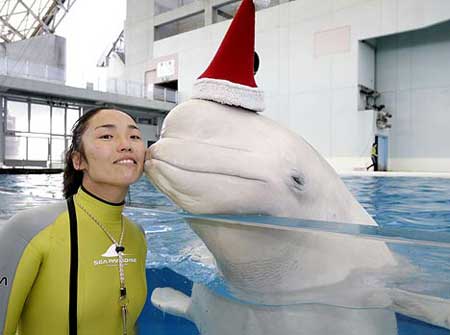 中新網(wǎng)12月19日 綜合媒體報道,由于圣誕節(jié)將至,日本橫濱八景島海洋樂園為了吸引更多的游客前來游覽亮出奇招,給館內(nèi)的兩頭白鯨戴上可愛的圣誕帽,前來游覽的游客甚至有機會得到這兩頭戴著圣誕帽的白鯨的親吻。