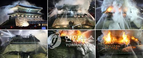 位于首爾中區南大門4街的崇禮門樓閣上10日晚上8點50分左右開始出現火焰。據現場第一目擊者、出租車司機李某(44歲)講述,當時有一位50歲左右的男子拿著購物袋上了崇禮門旁邊的臺階,之后就像放煙花一樣崇禮門樓閣上出現了火焰。