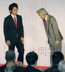 日本前首相小泉純一郎在演講會(huì)上向接班人次子進(jìn)次郎行禮。
