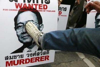 反政府示威者抗議總理頌猜采用強制手段鎮壓民眾。當日,示威者封鎖了一條商業街道,并四處散發記錄7日警民對峙的碟片及照片,還有人高舉稱警察總長和頌猜為“殺手”的標語。